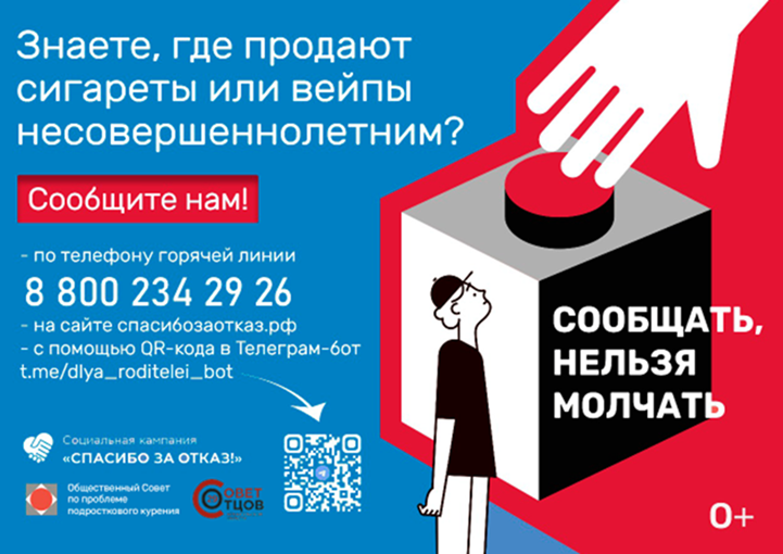 «Спасибо за отказ!» - открыта «горячая линия» для приема сообщений о местах продажи сигарет и вейпов подросткам. Звоните: 8-800-234-29-26, пишите на сайте спасибозаотказ.рф (раздел "сообщите о нарушении") или в телеграм-боте «Родительский патруль» (t.me/dlya_roditelei_bot)